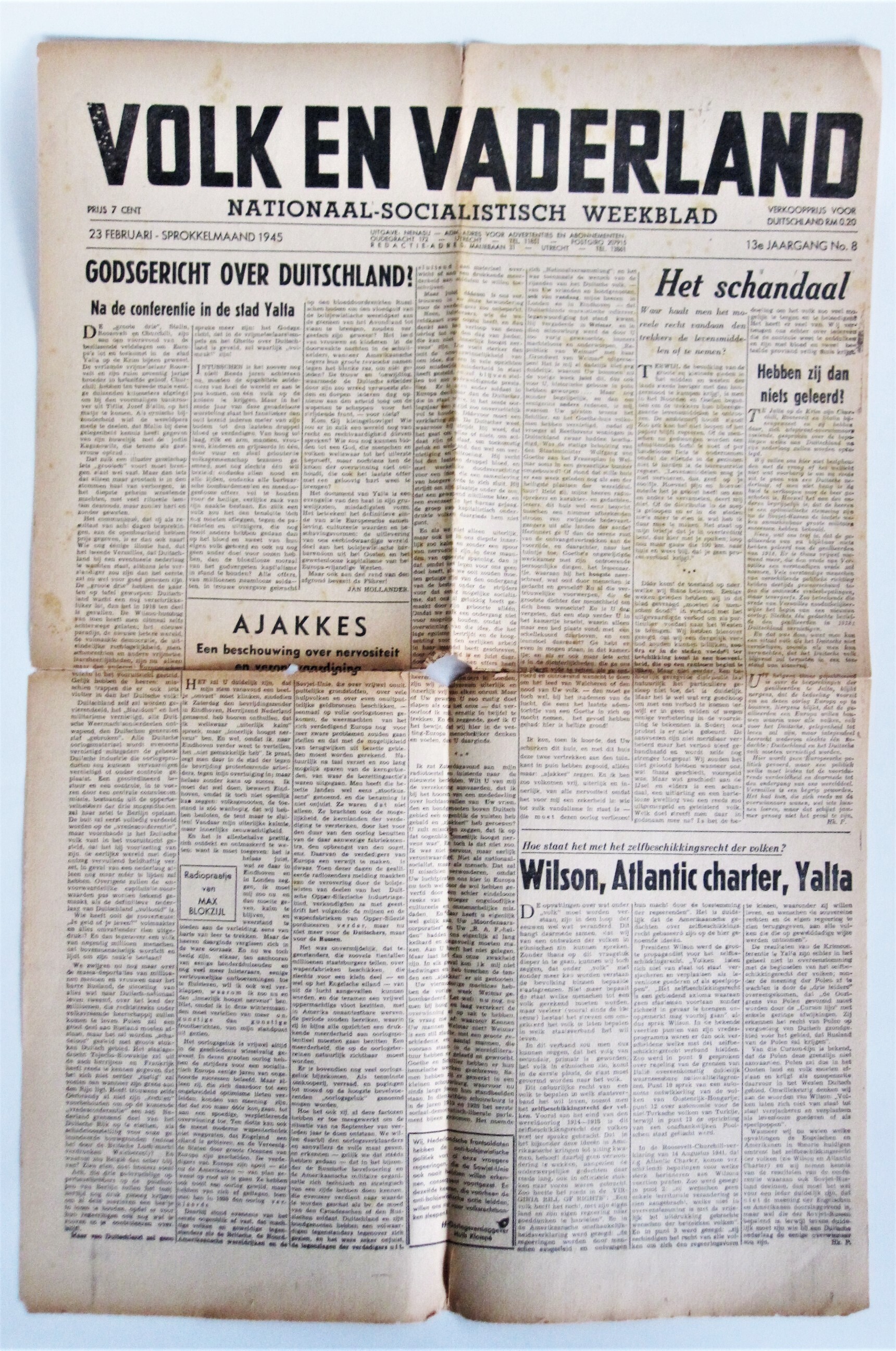 Jaargang dertien van 'Volk en Vaderland', nationaalsocialistisch weekblad van de N.S.B. Het betreft 1 exemplaar van No. 8, 23 februari-sprokkelmaand 1945.