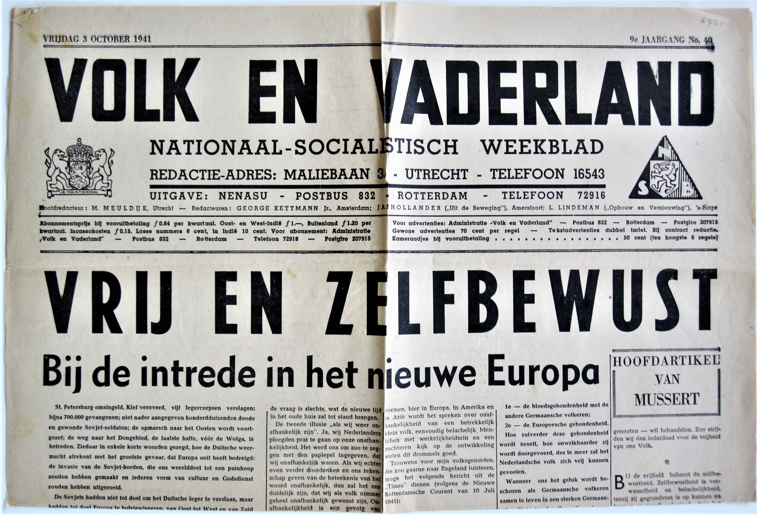 Exemplaar van het Nationaalsocialistisch weekblad ''Volk en Vaderland'' van de N.S.B. Het betreft jaargang 9, nummer 40 van 3 oktober 1941.