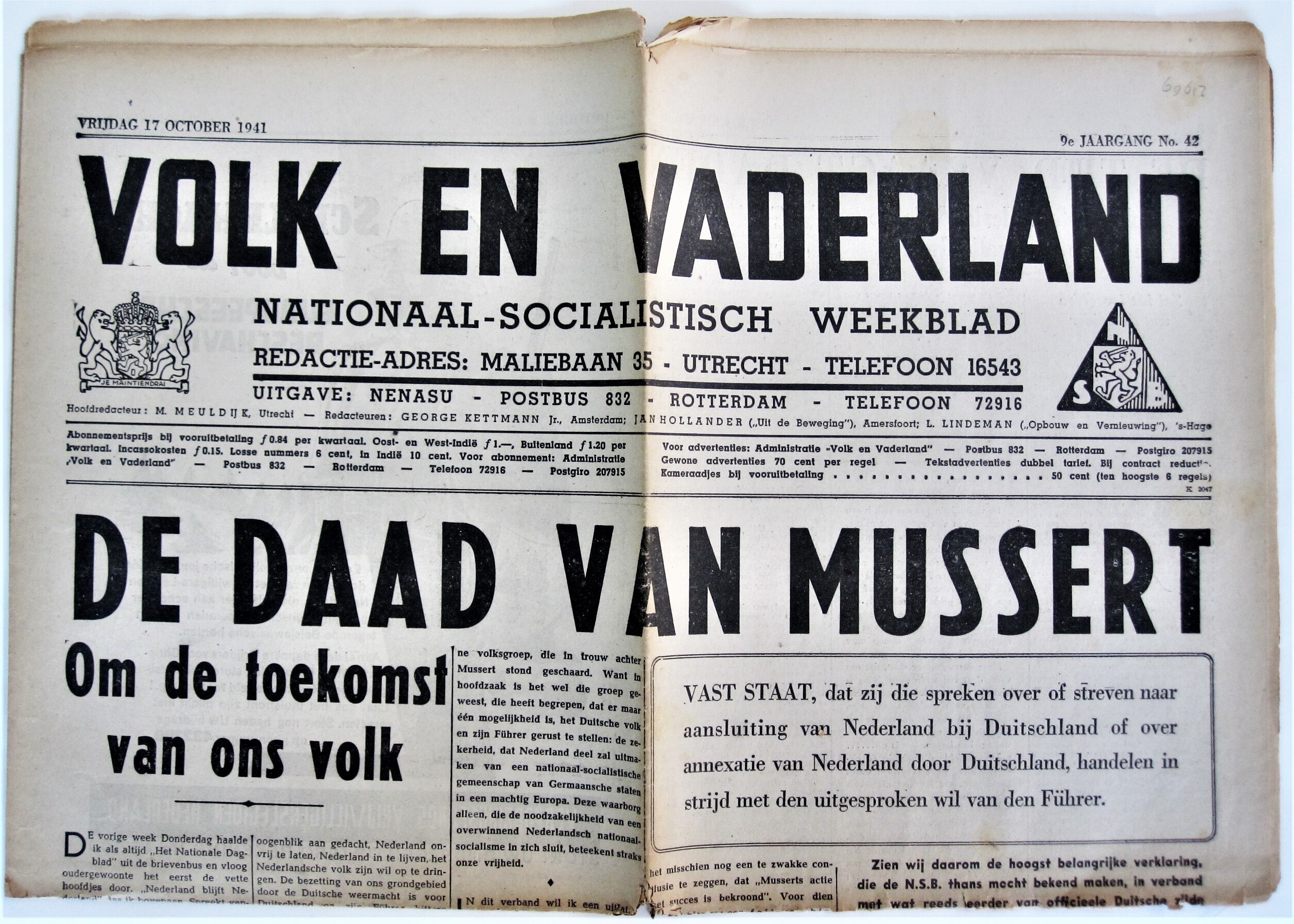 Exemplaar van het Nationaalsocialistisch weekblad ''Volk en Vaderland'' van de N.S.B. Het betreft jaargang 9, nummer 42 van 17 oktober 1941.