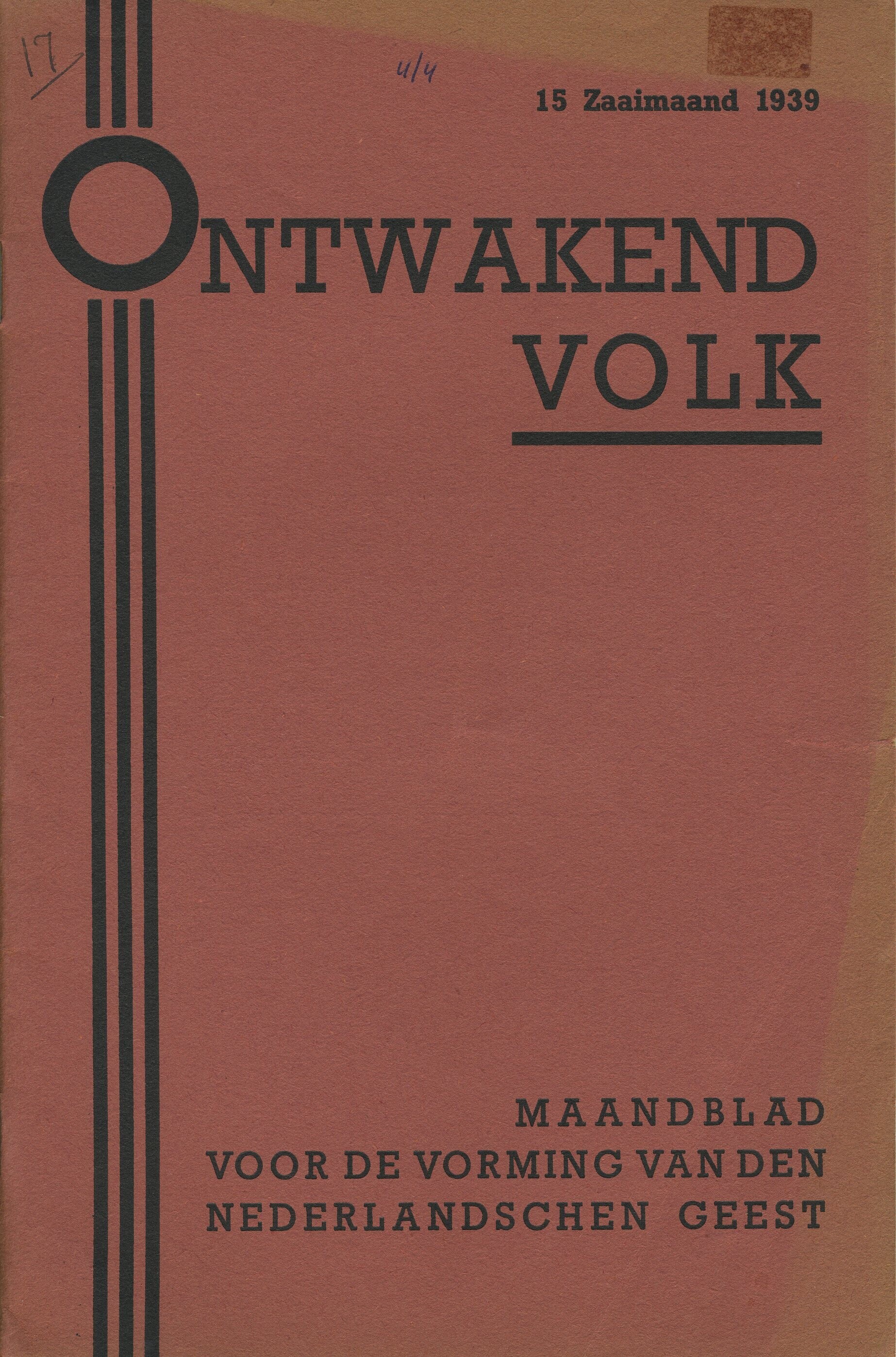 Een exemplaar van ''Ontwakend Volk, maandblad voor de vorming van den Nederlandschen geest'' van de N.S.B. Het betreft de vierde jaargang nummer 4. Zaaimaand 1939 (Oktober 1939).
