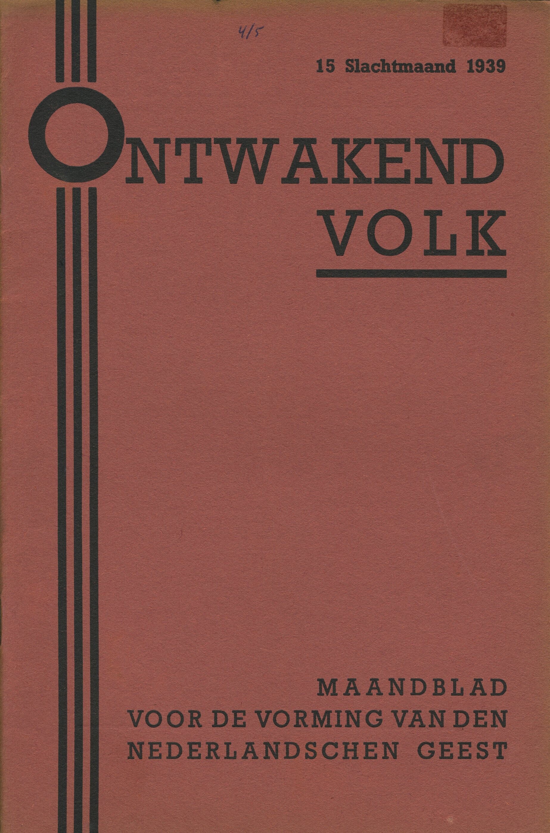 Een exemplaar van ''Ontwakend Volk, maandblad voor de vorming van den Nederlandschen geest'' van de N.S.B. Het betreft de vierde jaargang nummer 5. Slachtmaand 1939 (November 1939).