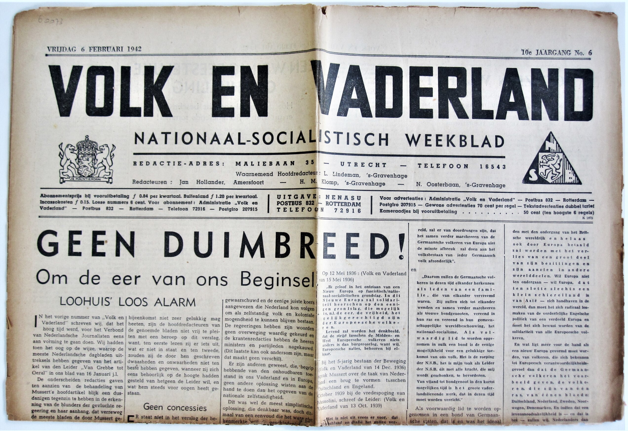 Twee exemplaren van het Nationaalsocialistisch weekblad ''Volk en Vaderland'' van de N.S.B. Het betreft jaargang 10, nummer 6 van 6 februari 1942.