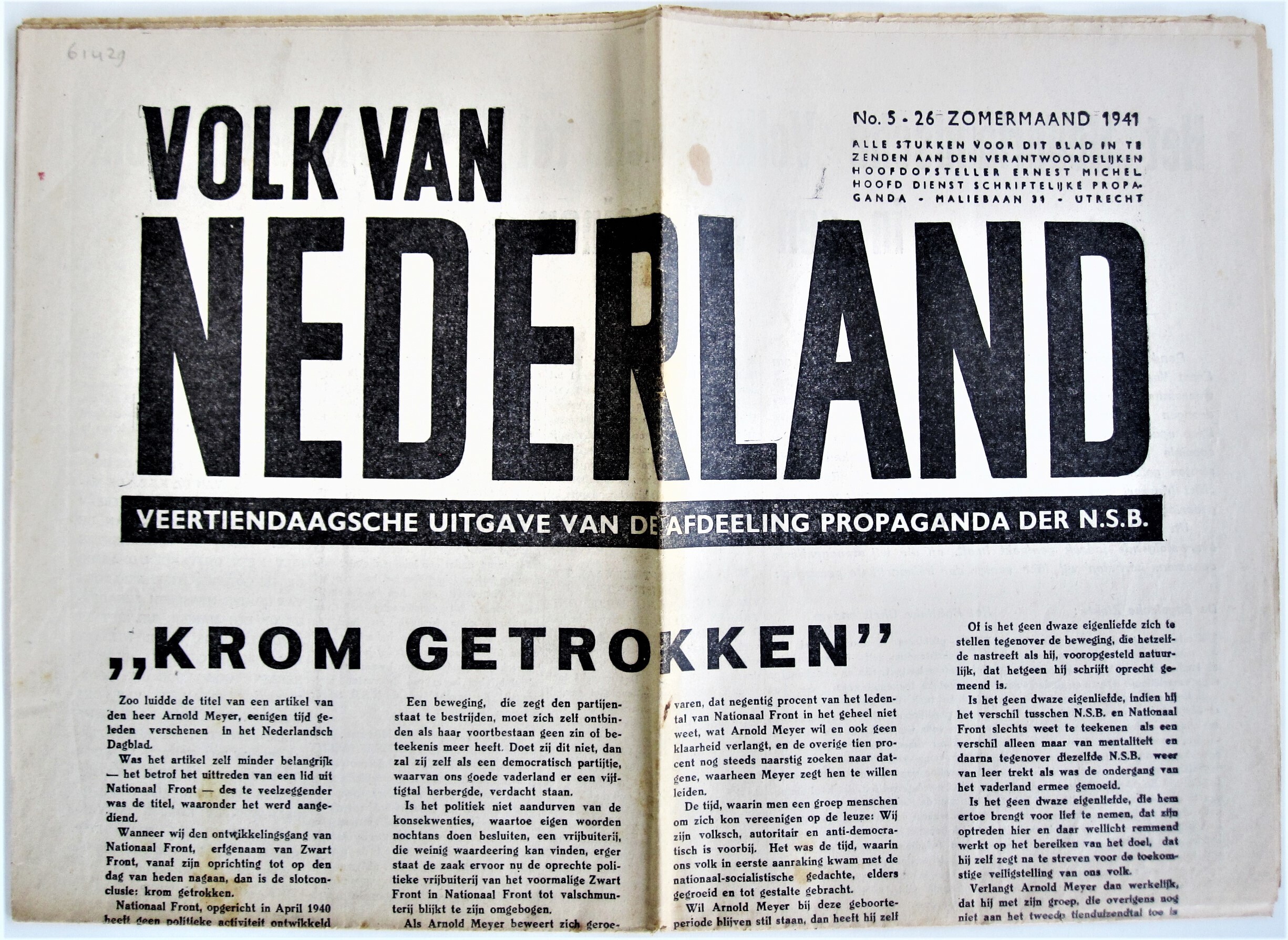 Editie van "Volk van Nederland. Veertiendaagsche uitgave van de afdeeling propaganda der N.S.B". Het betreft nummer 5, 26 Zomermaand 1941.