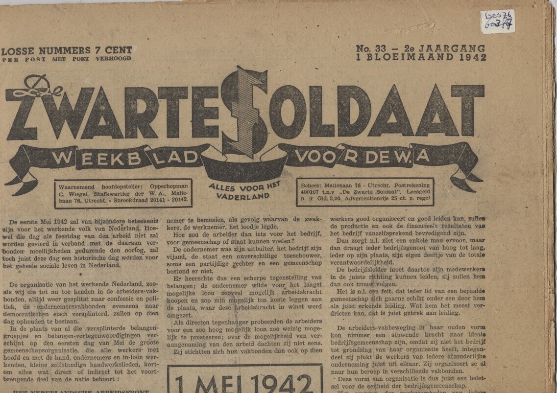 Editie van ''De zwarte soldaat. Weekblad voor de W.A. in Nederland". Het betreft nummer 33 van Bloeimaand (mei) 1942.