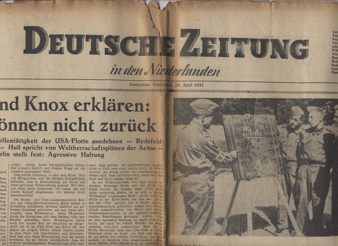 Editie van "Deutsche Zeitung in den Niederlanden". Het betreft de eerste jaargang nummer: 321 van 26 april 1941.
