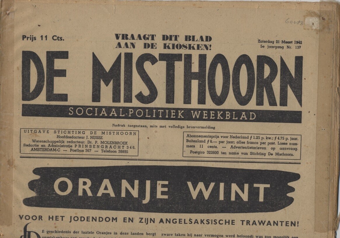 Editie van het Nationaalsocialistisch weekblad "De misthoorn, sociaal-politiek weekblad". Het betreft nummer 137 van jaargang 5 van 21 maart 1942.