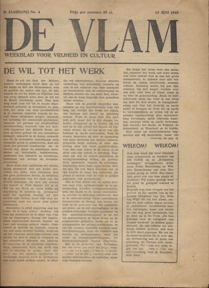 Een uitgave van "De Vlam. Weekblad voor vrijheid en cultuur" eerste jaargang nummer 4 van 15 juni 1945. Dit blad is een voortzetting van het weekblad “De Vonk". Het blad telt 4 bladzijden.