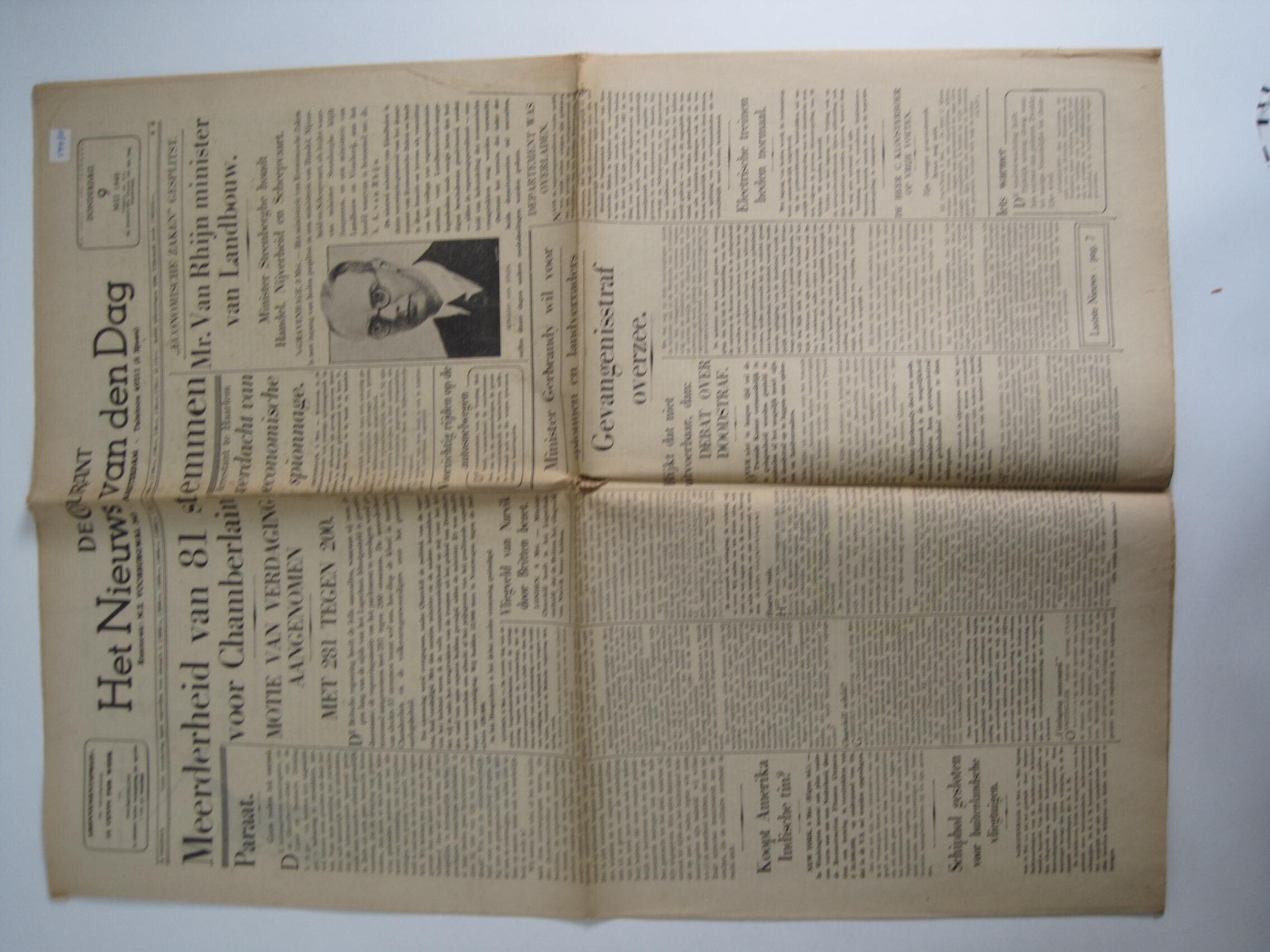 "De Courant - Het Nieuws van den Dag" van 9 mei 1940 (o.a. "Meerderheid van 81 stemmen voor Chamberlain" , "Het huis van Oranje verlaat zijn post nooit" n.a.v. aanbod van Hendrik Willem van Loon.<br>
