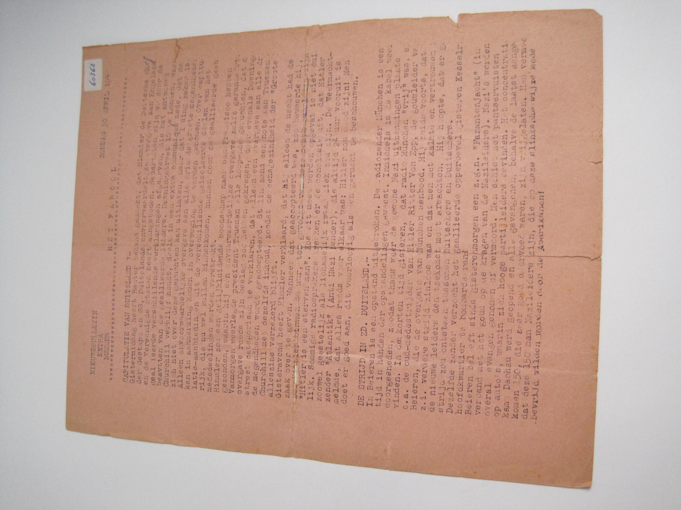 Op inschrijfkaart:<br>Illegaal blad "Het Parool".<br>Nieuwsbulletin, extra nummer.<br>Zondag 30 april 1945.<br><br><br>