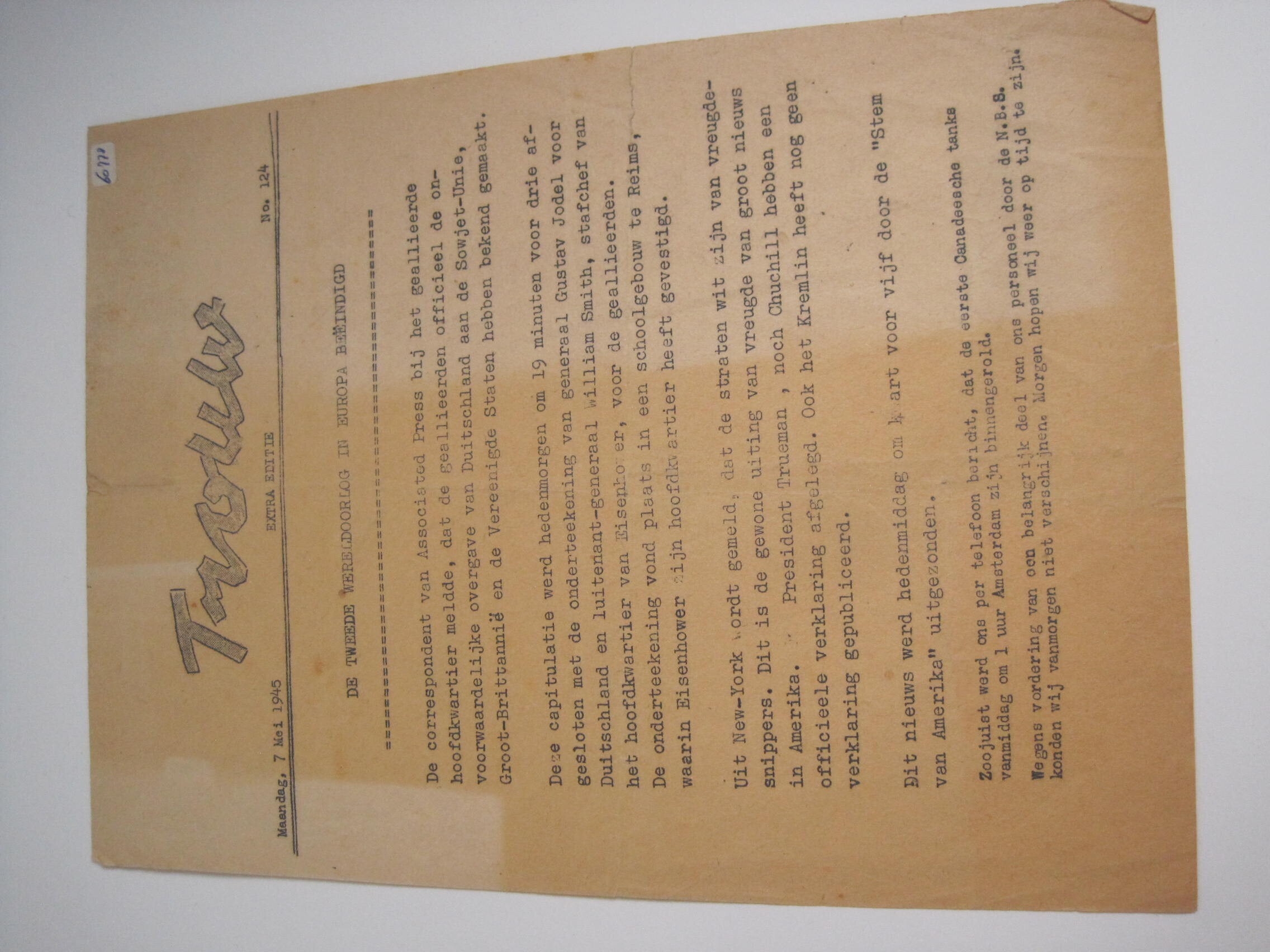 Illegaal blad "Trouw", extra editie, 7 mei 1945 (no. 124)<br>Tweede Wereldooorlog in Europa beëindigd.<br><br><br>