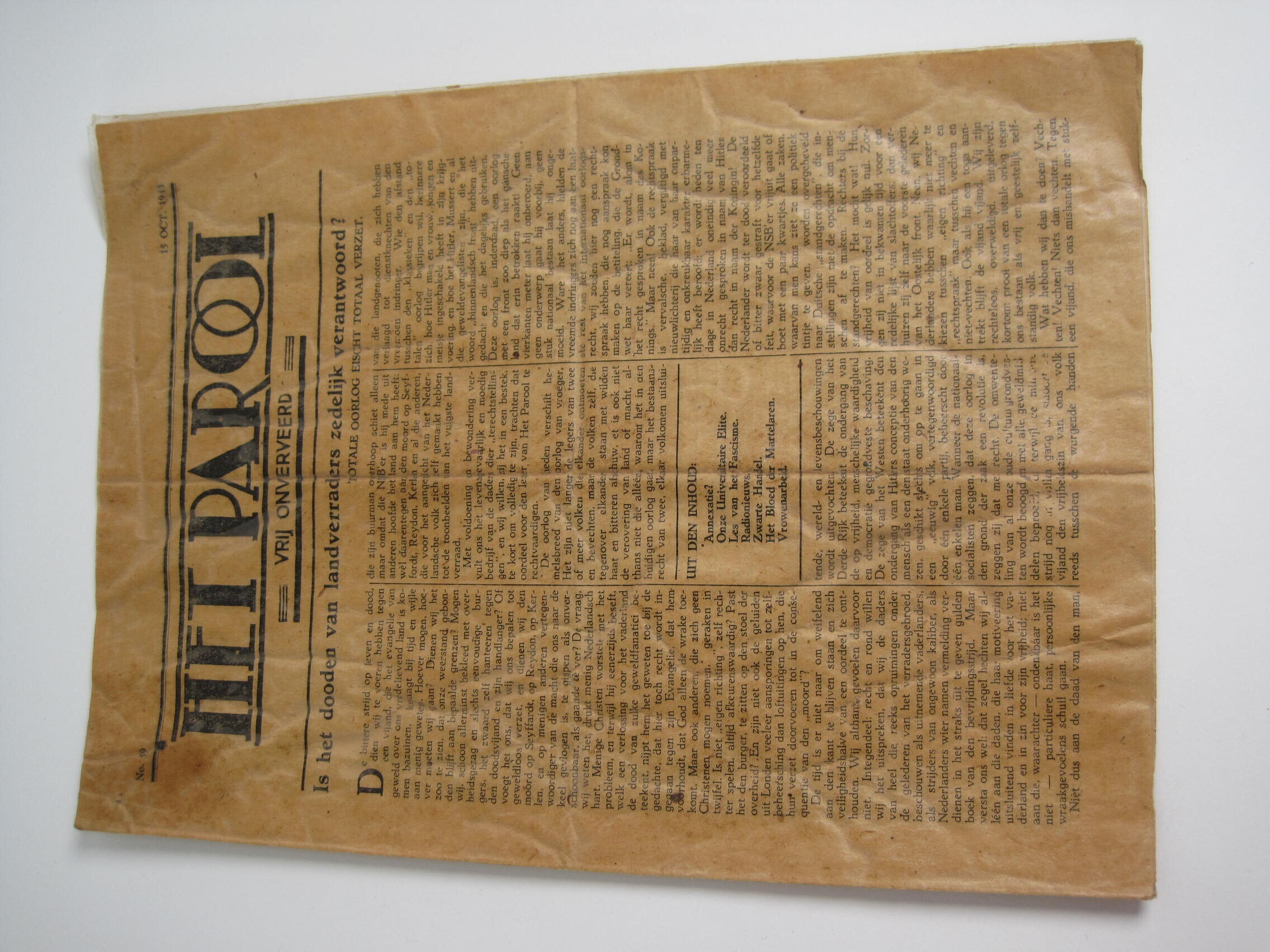 <br>Illegaal blad "Het Parool", no.59., 15 oct. 1943, gedrukt exemplaar, 8 blz. geplastificeerd.<br>