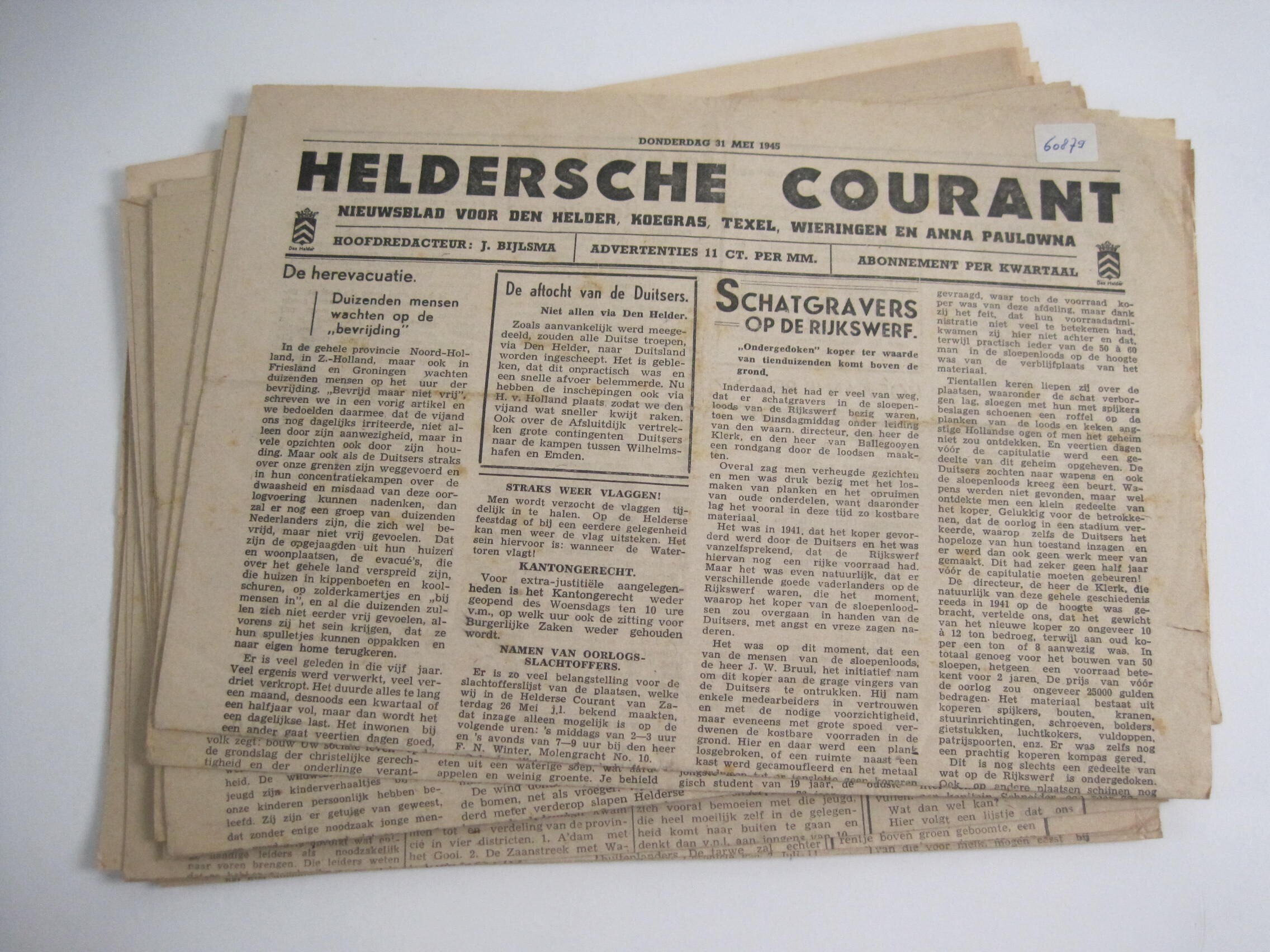Exemplaren van de Heldersche Courant:<br>31 mei 1945.<br>7, 14, 16 juni 1945.<br>12, 14, 16, 18, 19, 20, 21 en 23 juli 1945.<br>4 en 7 aug. 1945<br>