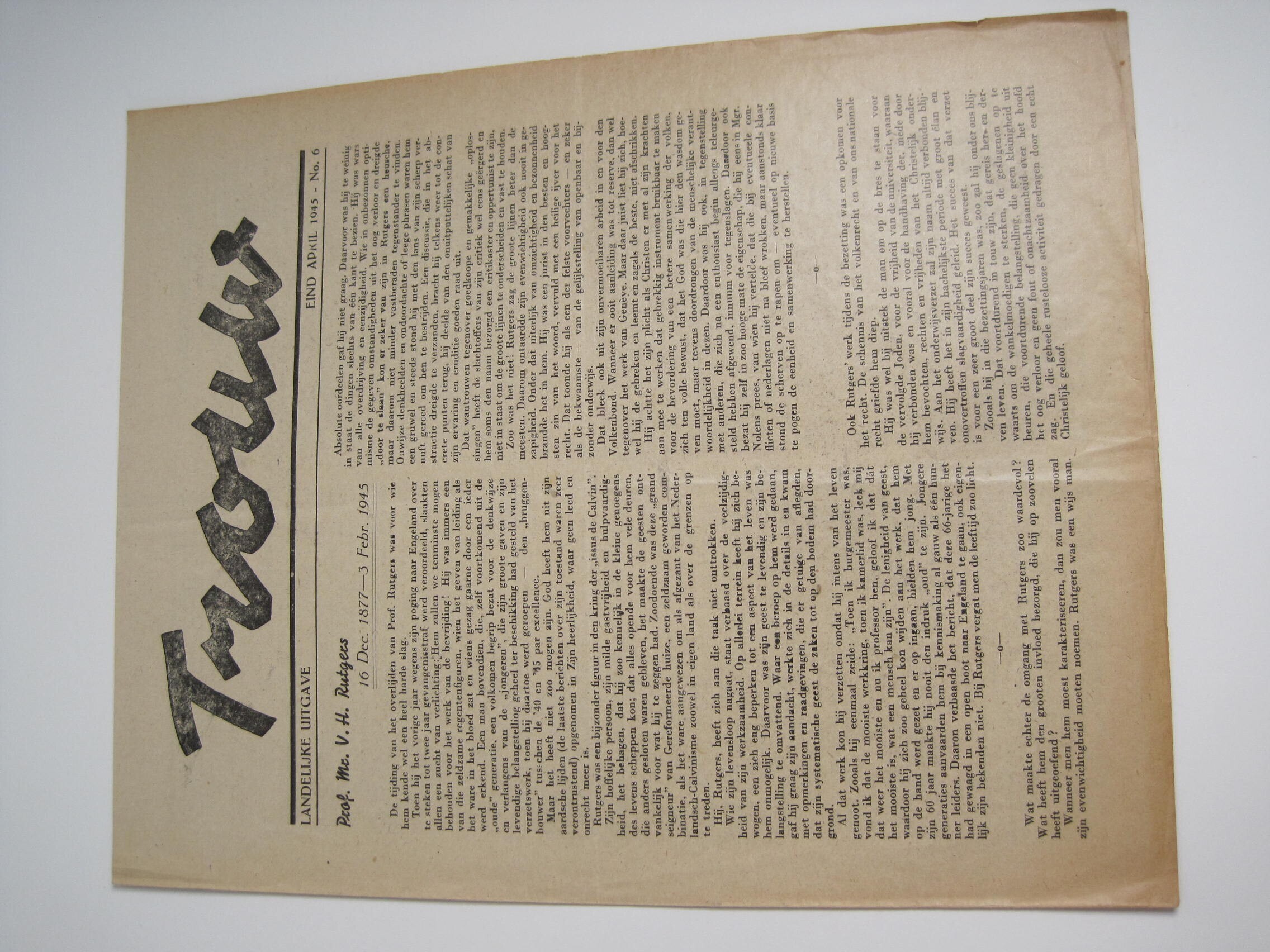 Illegaal blad Trouw. Landelijke uitgave eind april 1945, no. 6<br>o.a. De Strijd voor de Bevrijding van Indonesië .<br>