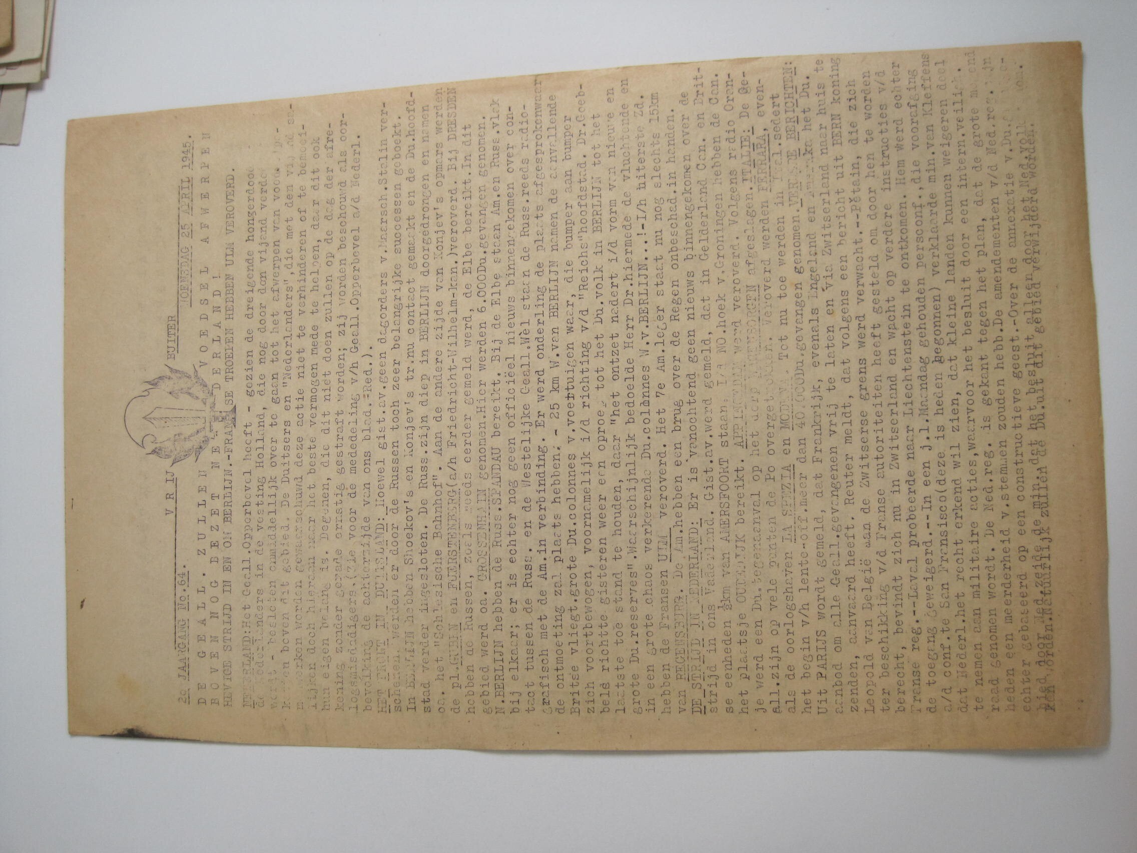 Nieuwsbulletin Vrijbuiter, 25 april 1945 (2e jaargang, nr. 64). Voedseldroppings en boodschap van de geallieerde opperbevelhebber aan de Ned. bevolking.