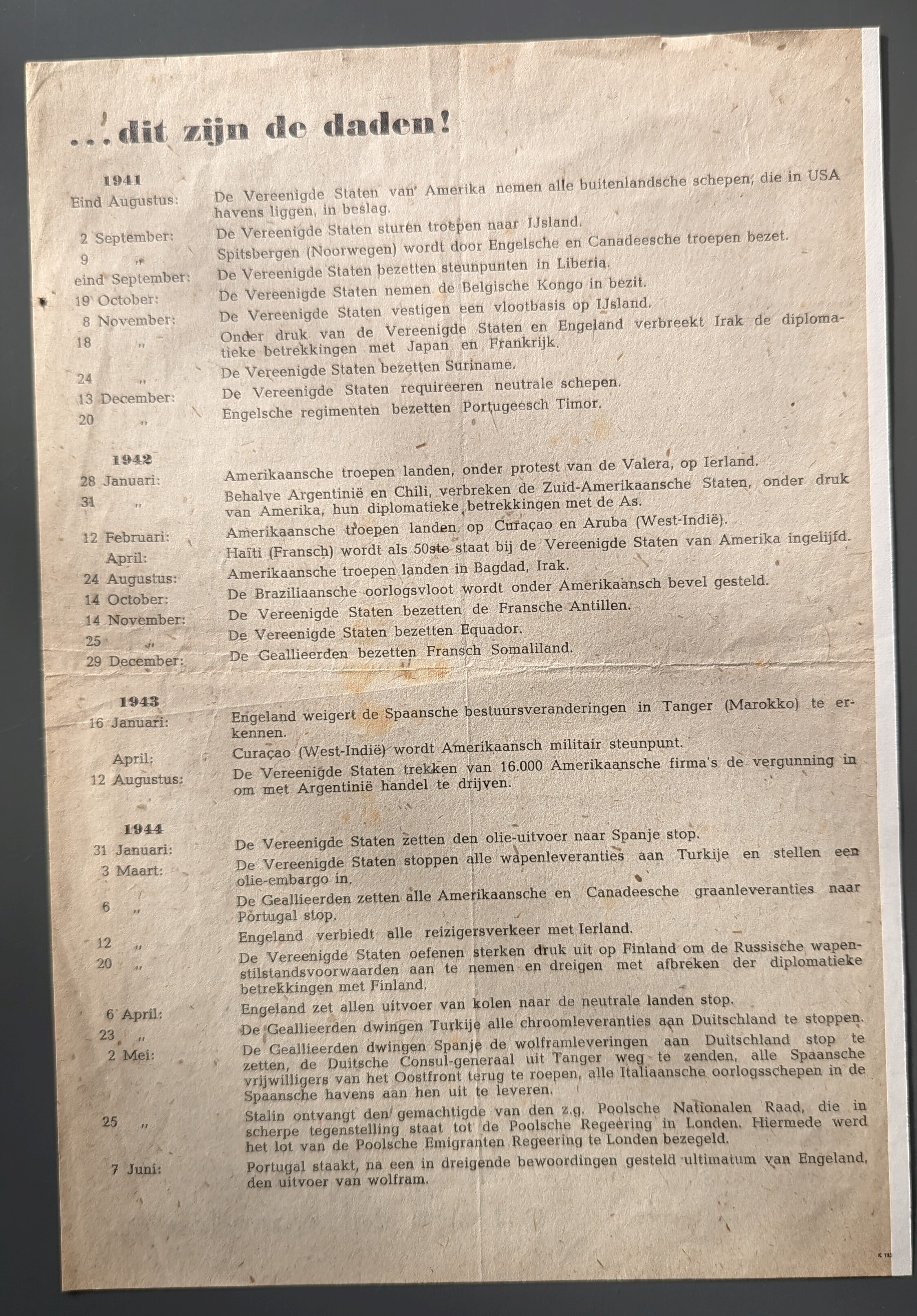 Op een pagina bedrukte tekst van het 'Atlantic Charter' of 'Atlantisch Handvest". De tekst is in twee kolommen gezet, links de Engelstalige versie, rechts de Nederlandstalige. Onderaan de tekst: "Dit zijn de woorden'. Op de achterkant: "Dit zijn de daden", met daaronder een chronologisch overzicht van Geallieerde acties, van de inbeslagname van buitenlandse schepen in Amerikaanse havens in augustus 1941 tot en met het staken van de export van wolfraam door Portugal op 7 juni 1944. De Atlantic Charter (Atlantisch Handvest) was een politiek manifest dat regeringsleiders Churchill en Roosevelt op 14 augustus 1941 opstelden. Zij formuleerden acht uitgangspunten voor een naoorlogse wereld die tijdens een conferentie op 1 januari 1942 door 26 landen werden onderschreven en aldus de basis legden voor de oprichting van de Verenigde Naties op 24 oktober 1945.
