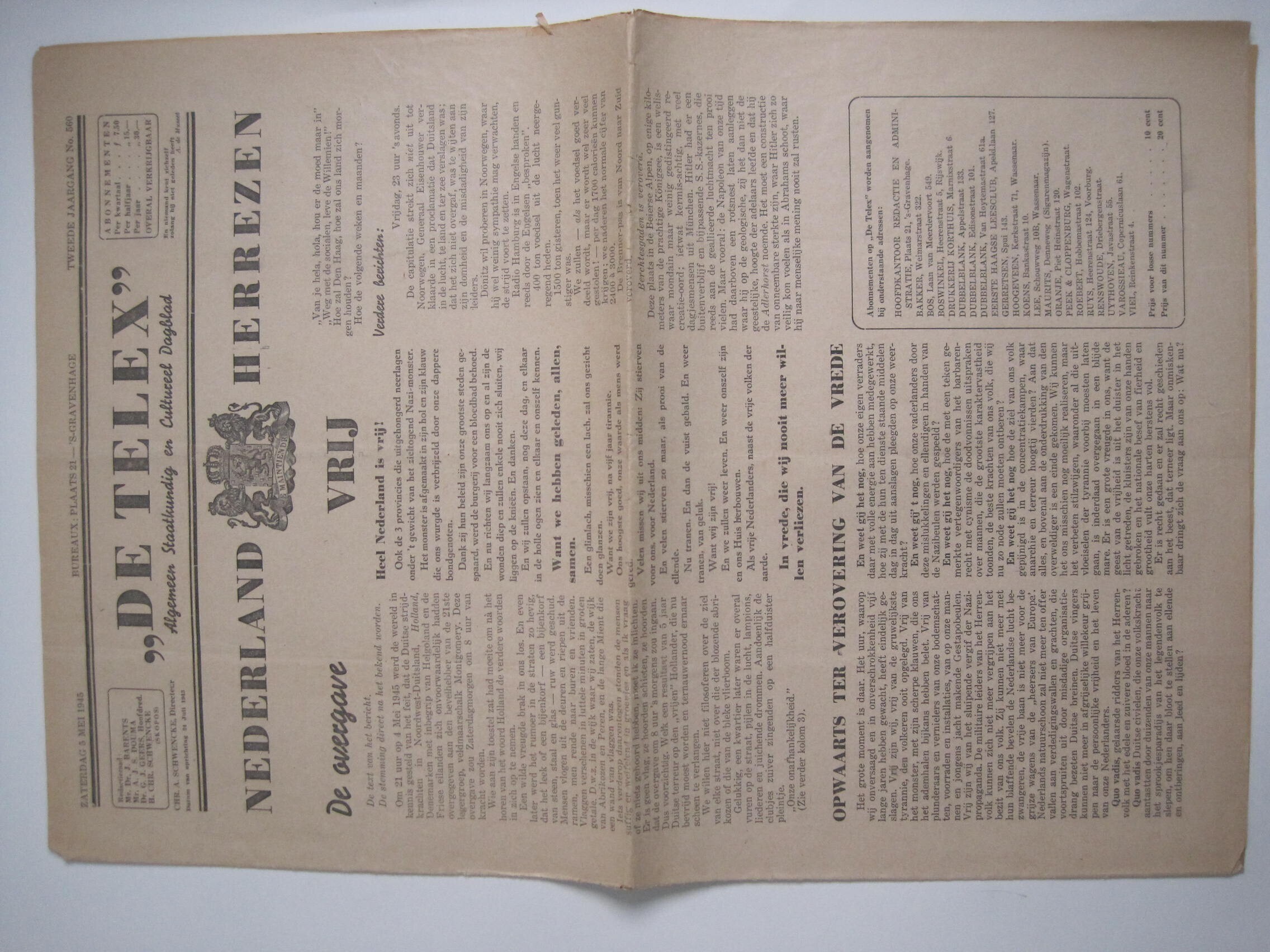 De Telex. Algemeen Staatkundig en Cultureel Dagblad. 2e jaargang no. 560. Zaterdag 5 mei 1945 (bevrijdingsnummer)