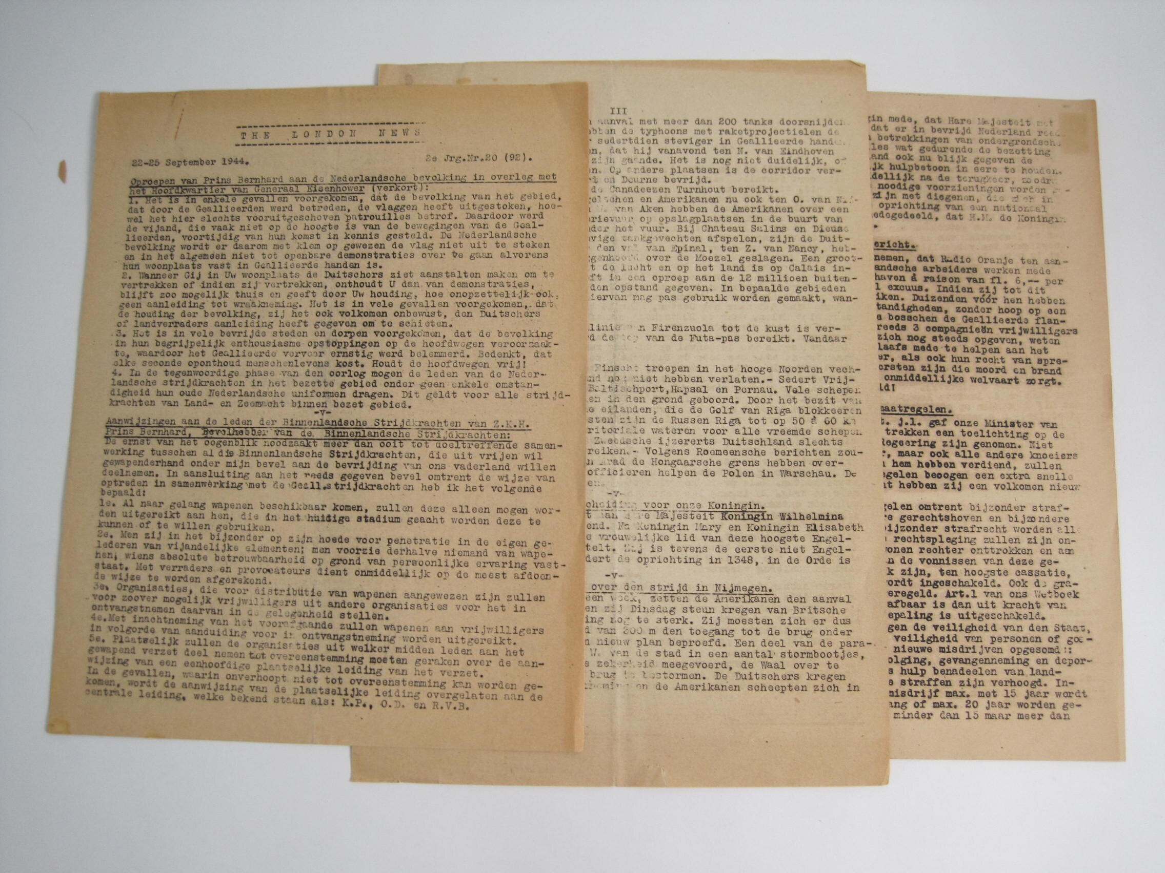 Illegaal blad "The London News" , 2e jaargang no. 20 (92)<br>22 - 25 Sept. 1944<br>6 blz. gestencild.<br>o.a. tekst van oproepen Prins Bernard en Eisenhower.