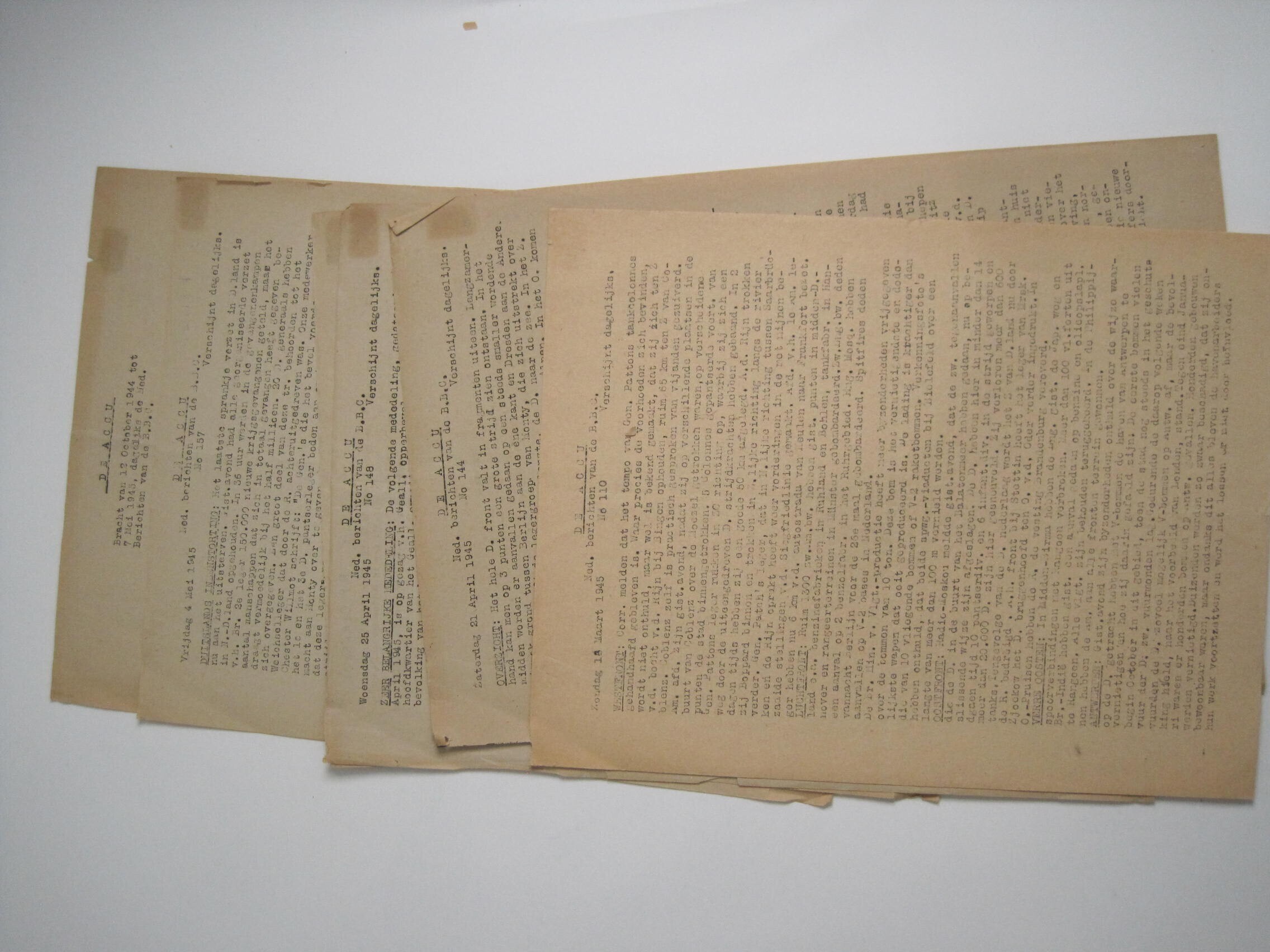 6 exemplaren van De Accu uit 1945. Accu : B(etrouwbare) B(erichten) C(entrale) was een verzetsblad uit de Tweede Wereldoorlog, dat vanaf 11 oktober 1944 tot en met 11 mei 1945 in Amsterdam werd uitgegeven. Het blad verscheen dagelijks in een oplage tussen de 1000 en 4000 exemplaren. Het werd gestencild, maar tussen 11 december 1944 en 7 februari 1945 gedrukt en de inhoud bestond voornamelijk uit nieuwsberichten. Vanaf ca. nr.26 (1944) werd het uitgegeven met ondertitel: Ned. berichten van de BBC.