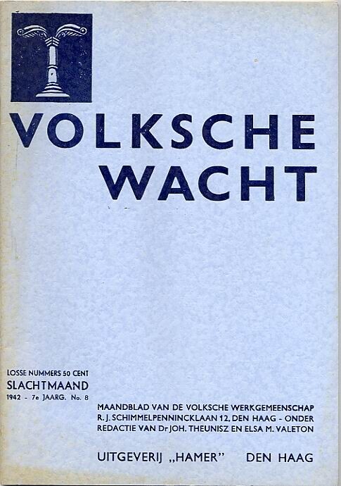 Jaargang 7 (1942) nummer 8 van het tijdschrift Volksche Wacht. Dit maandblad werd vanaf 1939 door de N.S.B. uitgegeven. Het laatste nummer verscheen in 1944. Aanvankelijk werd het blad uitgegeven onder de namen De Wolfsangel en Der Vaderen Erfdeel. Het blad behandelde onderwerpen op het gebied van volkse cultuur, volkskunde, heemkunde, rassenkunde, erfgezondheid, bevolkingspolitiek en sibbekunde.