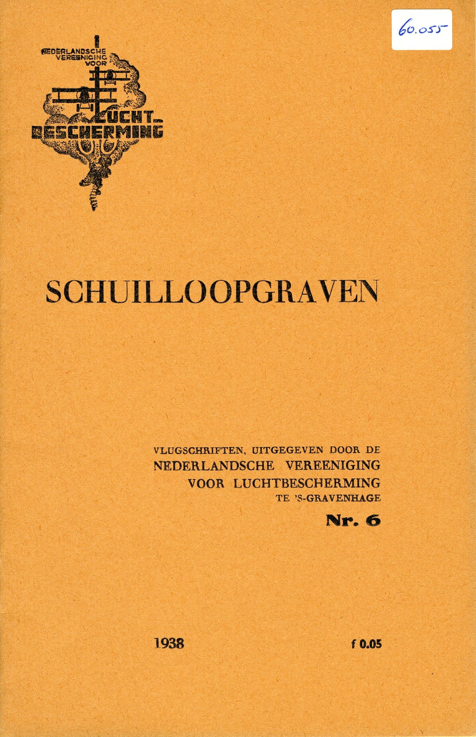 Uitgave van de Nederlandsche Vereeniging voor Luchtbescherming. Het betreft nummer 6 van een zevendelige reeks vlugschriften met instructies over de handelwijze bij luchtaanvallen. Op de oranje kaft is het logo afgebeld van de vereniging. Het zesde nummer omvat 8 pagina's en gaat over schuilloopgraven.