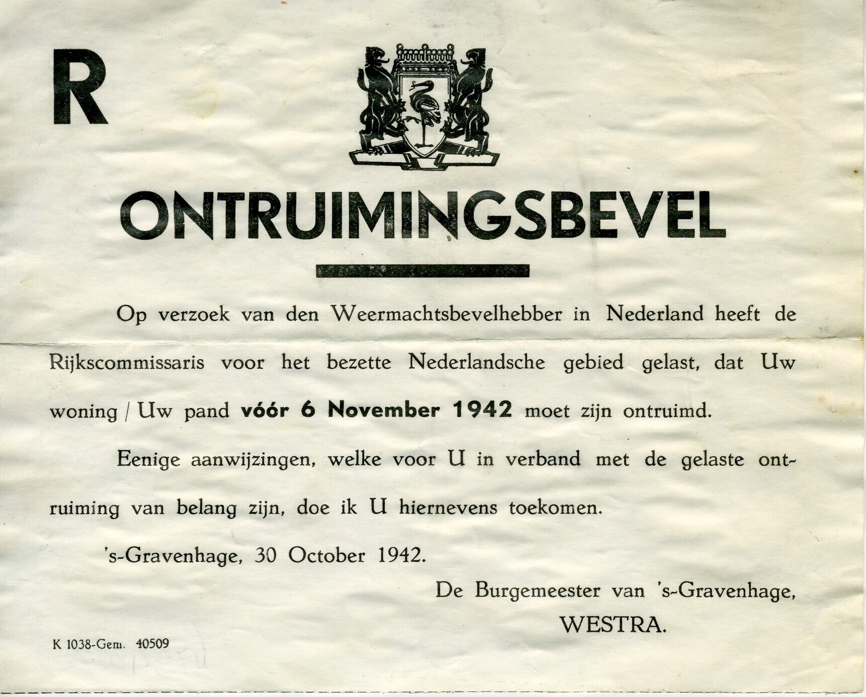Ontruimingsbevel waarin wordt medegedeeld dat de woning moet worden verlaten op verzoek van de Weermachtsbevelhebber in Nederland vóór 6 november 1942. Eronder de naam van burgemeester Westra van Den Haag.