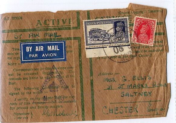 Vanuit India verstuurde bruine enveloppe met Engelstalige groene opdruk: ''de inhoud behoeft niet door de censuur te worden gecontroleerd''. Voorzien van stempel van de Britse censuur: "Passed by censor".