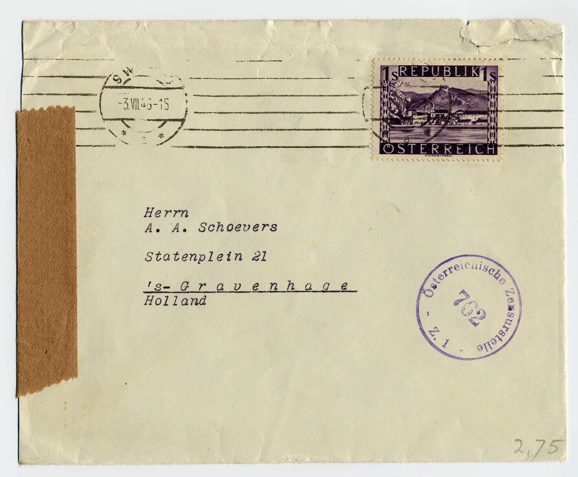 Twee enveloppen, geadresseerd aan A.A. Schoevers van Instituut Schoevers in Den Haag en verzonden vanuit Oostenrijk. Met stempels van de Oostenrijkse censuur no. 762 en no.565.