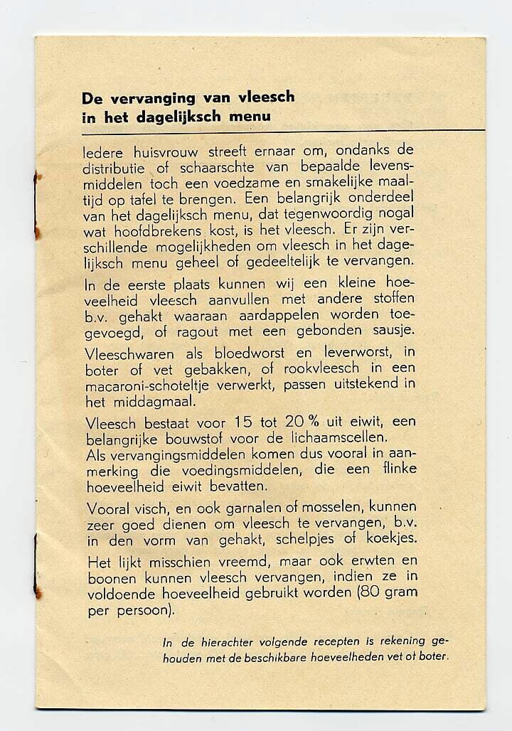 Boekje van acht pagina's over de vervanging van vlees. Tevens enkele recepten waarbij rekening is gehouden met de schaarsheid van de producten.