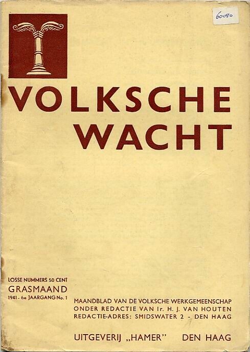 Jaargang 6 (1941) nummer 1 van het tijdschrift Volksche Wacht. Dit maandblad werd vanaf 1939 door de N.S.B. uitgegeven. Het laatste nummer verscheen in 1944. Aanvankelijk werd het blad uitgegeven onder de namen De Wolfsangel en Der Vaderen Erfdeel. Het blad behandelde onderwerpen op het gebied van volkse cultuur, volkskunde, heemkunde, rassenkunde, erfgezondheid, bevolkingspolitiek en sibbekunde.