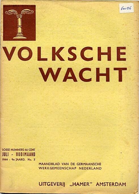 Jaargang 9 (1944) nummer 3 van het tijdschrift Volksche Wacht. Dit maandblad werd vanaf 1939 door de N.S.B. uitgegeven. Het laatste nummer verscheen in 1944. Aanvankelijk werd het blad uitgegeven onder de namen De Wolfsangel en Der Vaderen Erfdeel. Het blad behandelde onderwerpen op het gebied van volkse cultuur, volkskunde, heemkunde, rassenkunde, erfgezondheid, bevolkingspolitiek en sibbekunde.