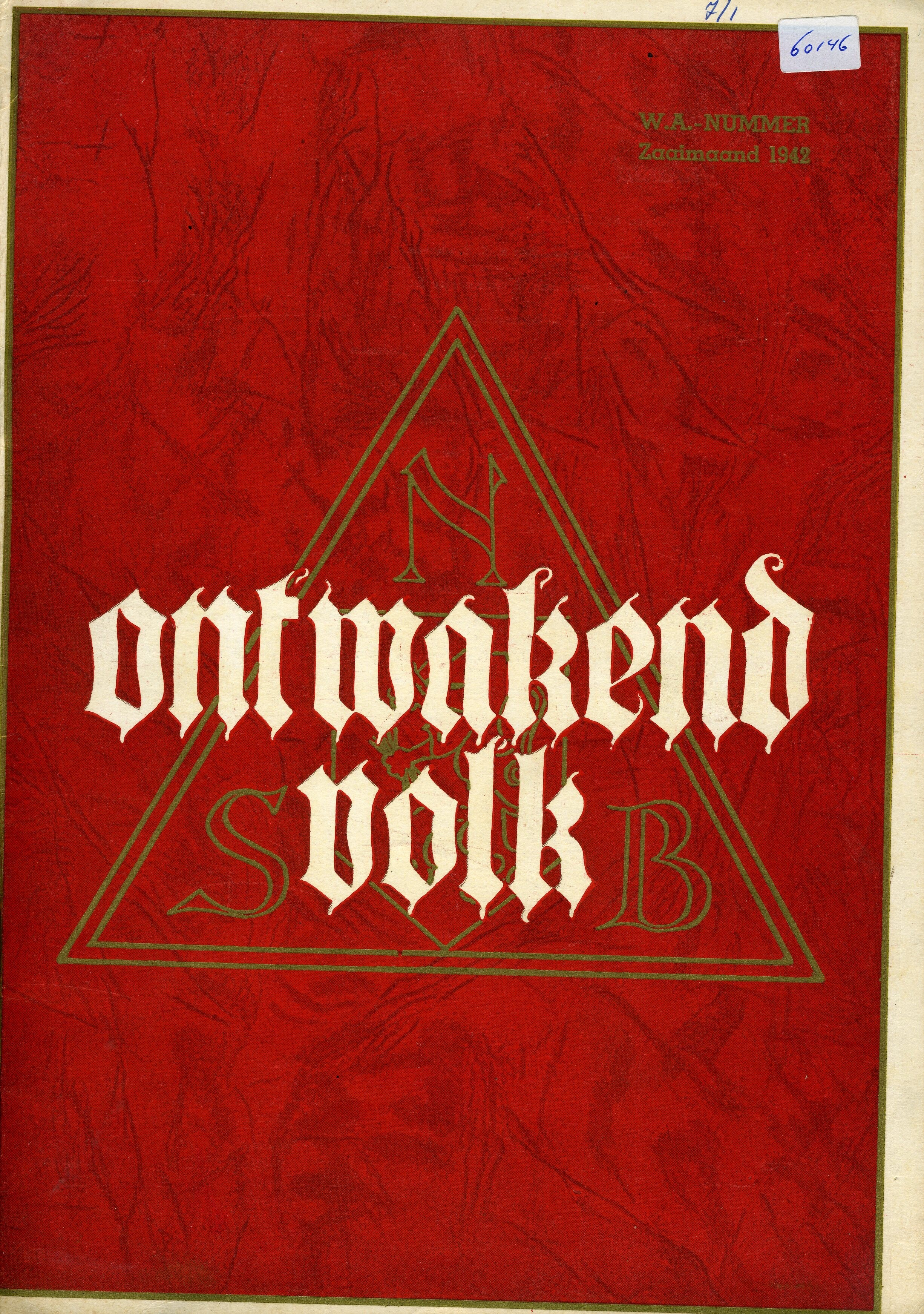 Een exemplaar van ''Ontwakend Volk, maandblad voor de vorming van den Nederlandschen geest'' van de N.S.B. Het betreft de zevende jaargang nummer 1., Zaaimaand 1942 (oktober 1942).Speciaal W.A.-nummer (Weerbaarheidsafdeling NSB).