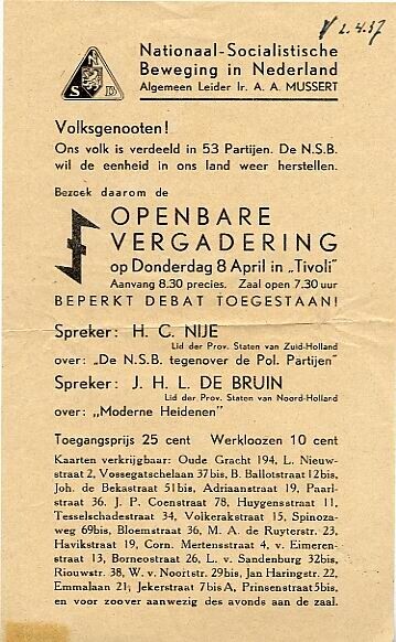Aankondiging van een N.S.B.-bijeenkomst in het Utrechtste Tivoli op 8 april 1937.