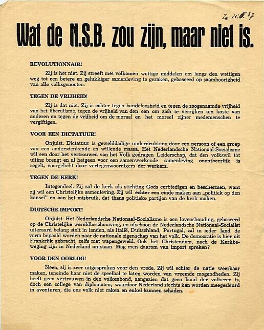 Pamflet waarin wordt betoogd dat de N.S.B. noch revolutionair noch tegen de vrijheid, voor een dictatuur, tegen de kerk, voor import uit Duitsland of voor de oorlog is.