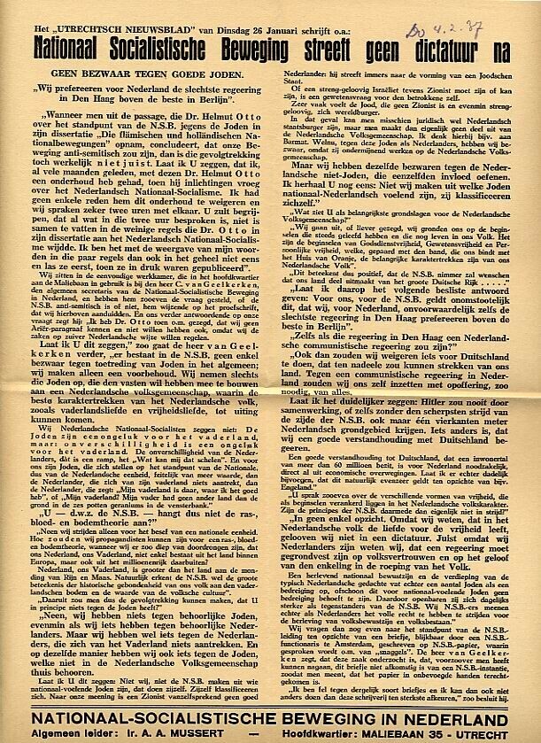 N.S.B.-pamflet met de tekst van een artikel uit het Utrechtsch Nieuwsblad van 26 januari 1937.