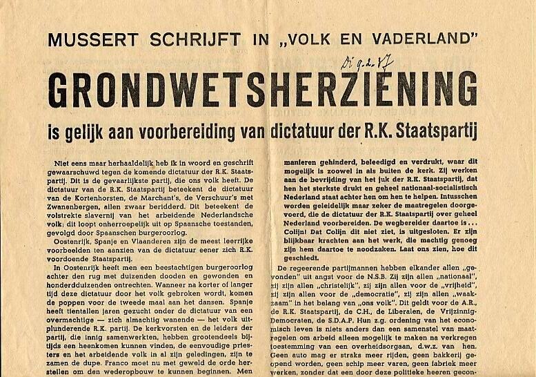 N.S.B.-pamflet met een overdruk van een artikel van Anton Mussert uit Volk en Vaderland.