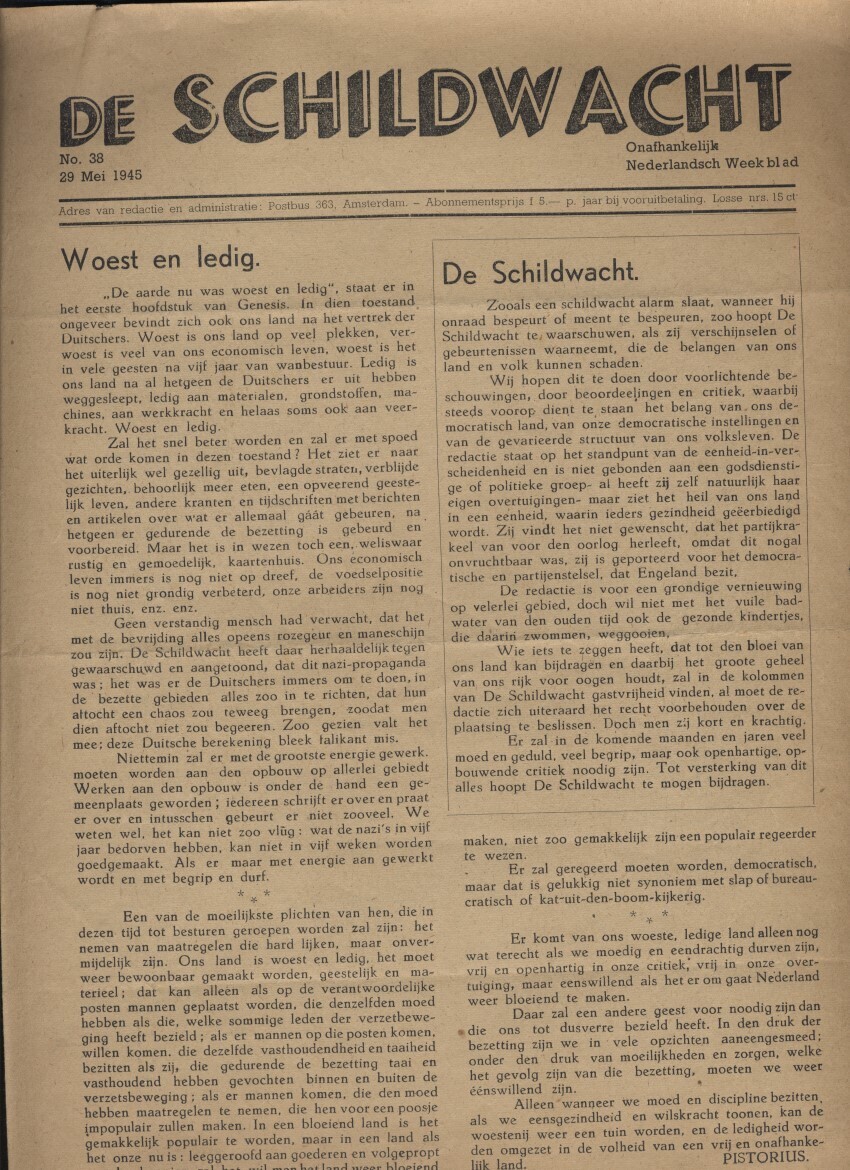 Zeven exemplaren van het weekblad 'De Schildwacht' uit 1945. Het betreft de nummers: 38 van 29 mei (2 stuks), 40 van 13 juni, 41 van 22 juni, 44 van 11 juli, 46 van 25 juli en 47 van 1 augustus.