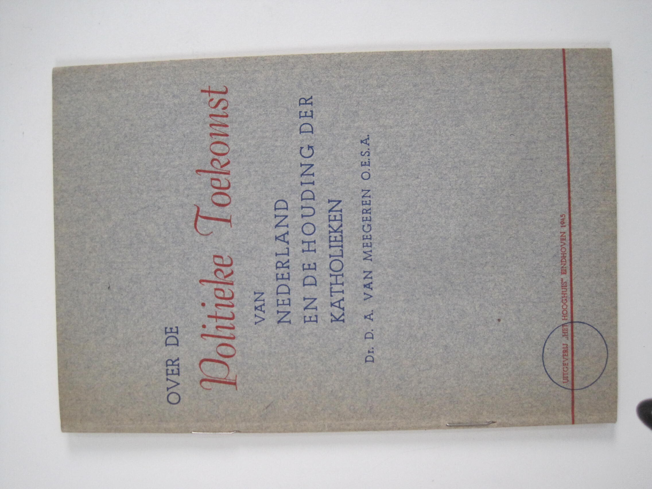 Een boekje "Over de politieke Toekomst van Nederland en de Houding der Katholieken" door Dr. D.A. van Meegeren O.E.S.A. Eindhoven, 1945. Het boekje telt 24 bladzijden.