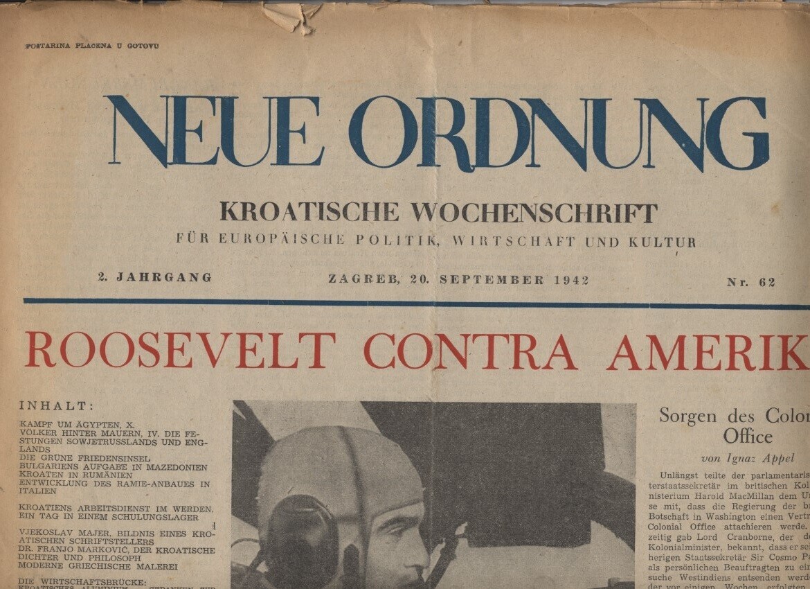 Editie van "Neue Ordnung. Kroatische Wochenschrift für Europaische Politiek, Wirtschaft und Kultur" op krantenformaat. Het betreft de tweede jaargang, nummer 62 van 20 september 1942.