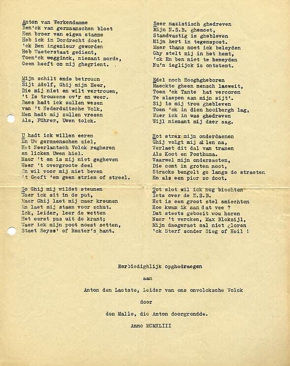 Twee stencils met een spottend gedicht over Anton Mussert (Anton van Werckendamme), vrij naar de tekst van het Wilhelmus.