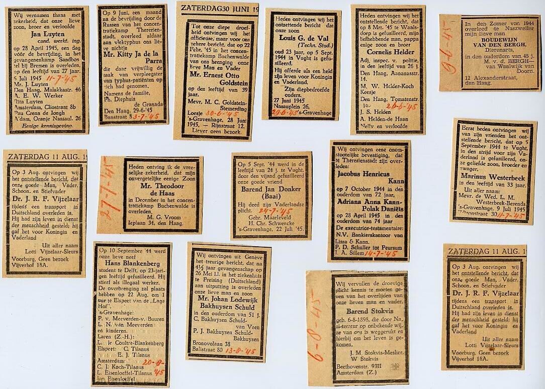 24 krantenknipsels van overlijdensberichten uit 1945, over personen die in gevangenen- of concentratiekampen zijn omgekomen of terechtgesteld. De datum is met rood potlood op de advertenties geschreven.