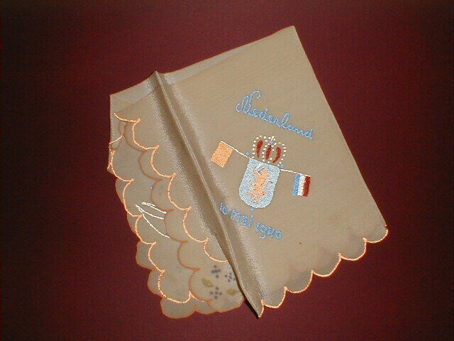 Een geborduurde witte zakdoek met in een hoek het Nederlandse wapen met een oranje en een rood-wit-blauwe vlag en de tekst "Nederland 10 mei 1940". Twee hoekpunten zijn met bloemen versierd, een hoekpunt met een duif. De geschulpte randen zijn met een oranje strookje versierd.