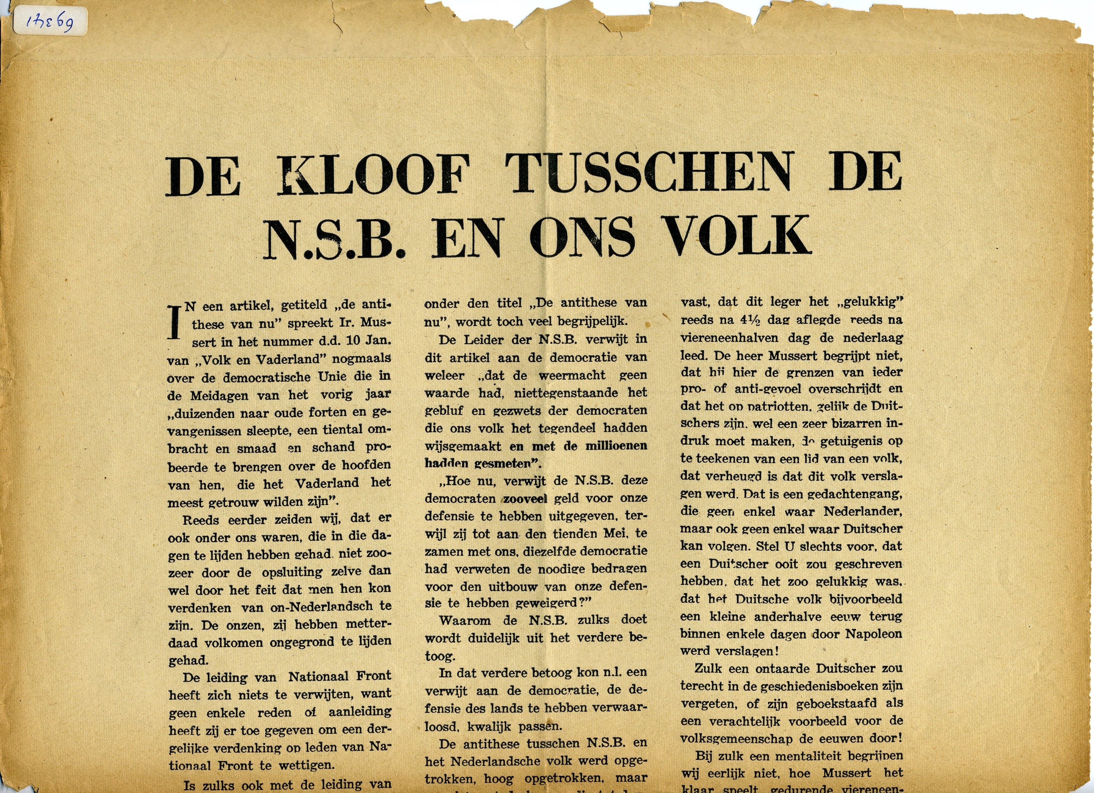 Aan een zijde bedrukt vel papier met een overdruk uit het ''Nederlandsch Dagblad'' van 15 januari 1941.
