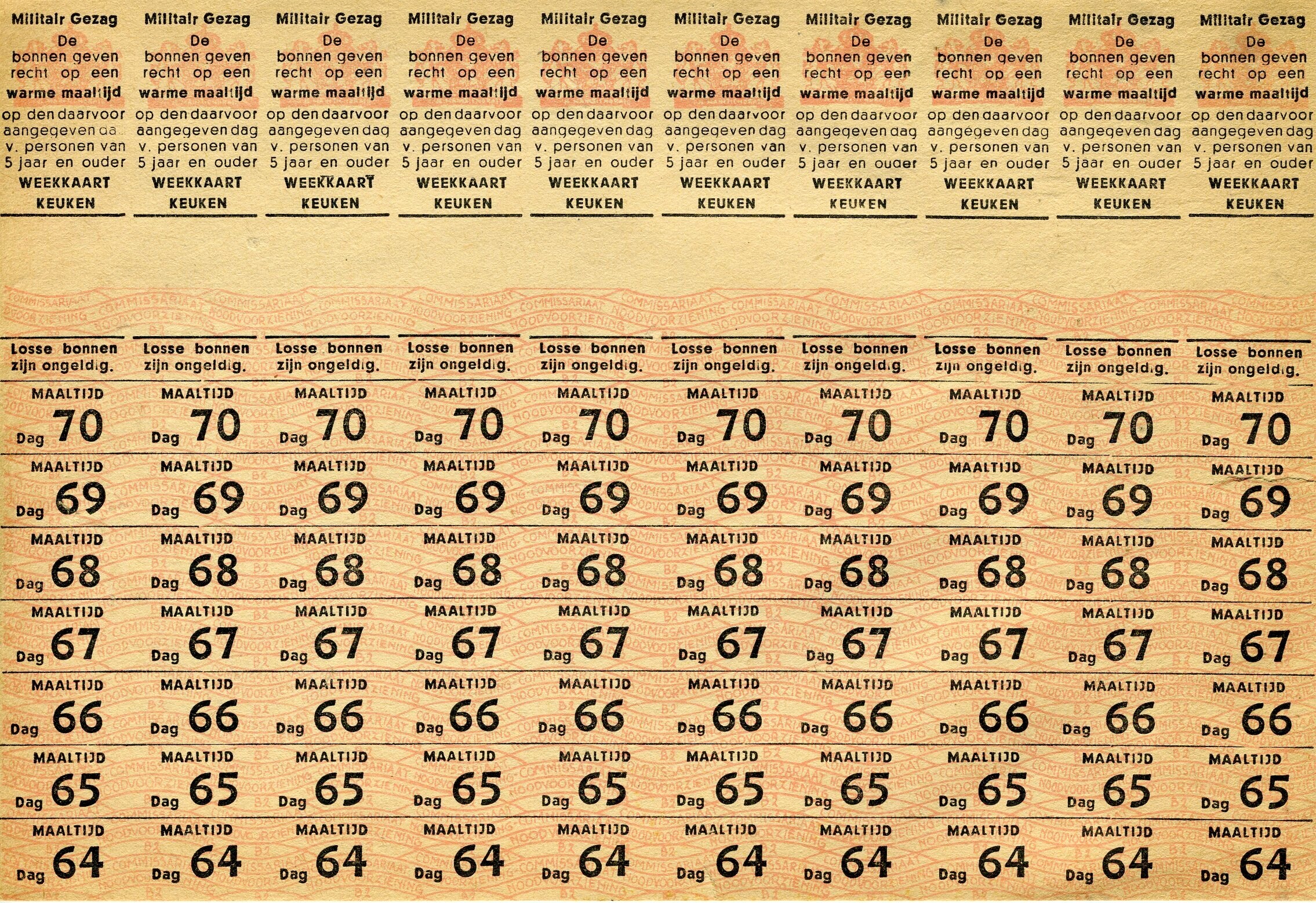 Twee identieke kaarten met bonnen voor een warme maaltijd, uitgegeven door het Militair Gezag.