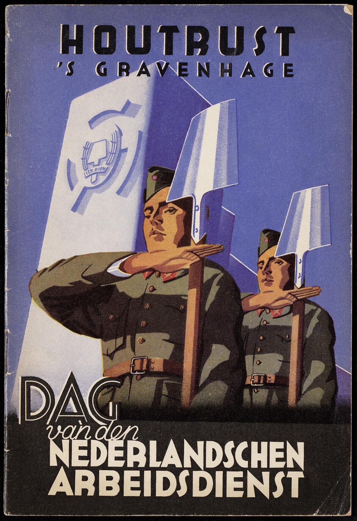 Programmaboekje voor de "Dag van den Nederlandschen Arbeidsdienst" op 3 mei 1942 in Houtrust, Den Haag. Op het omslag een afbeelding van twee saluerende mannen in uniform, "bewapend" met schop. Op de achtergrond een bouwwerk met het wapen van de Arbeidsdienst: een schop tussen twee korenaren en de tekst: "Ick dien". De uitgave bevat de teksten van de liederen die tijdens de bijeenkomst worden gezongen.