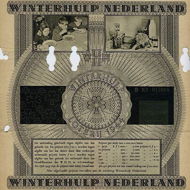 Een viertal loten van de Winterhulp Nederland, waarvan op één een prijs van vijftig cent is gevallen. De loten hebben een zwarte opdruk en zijn in negenen gevouwen en oorspronkelijk dichtgeplakt met een zegel. In het dichtgevouwen lot staat het lotnummer, de vermelding van de gewonnen prijs en is een foto te zien van een kinderen aan de maaltijd en een foto van de inhoud van een voedselpakket.