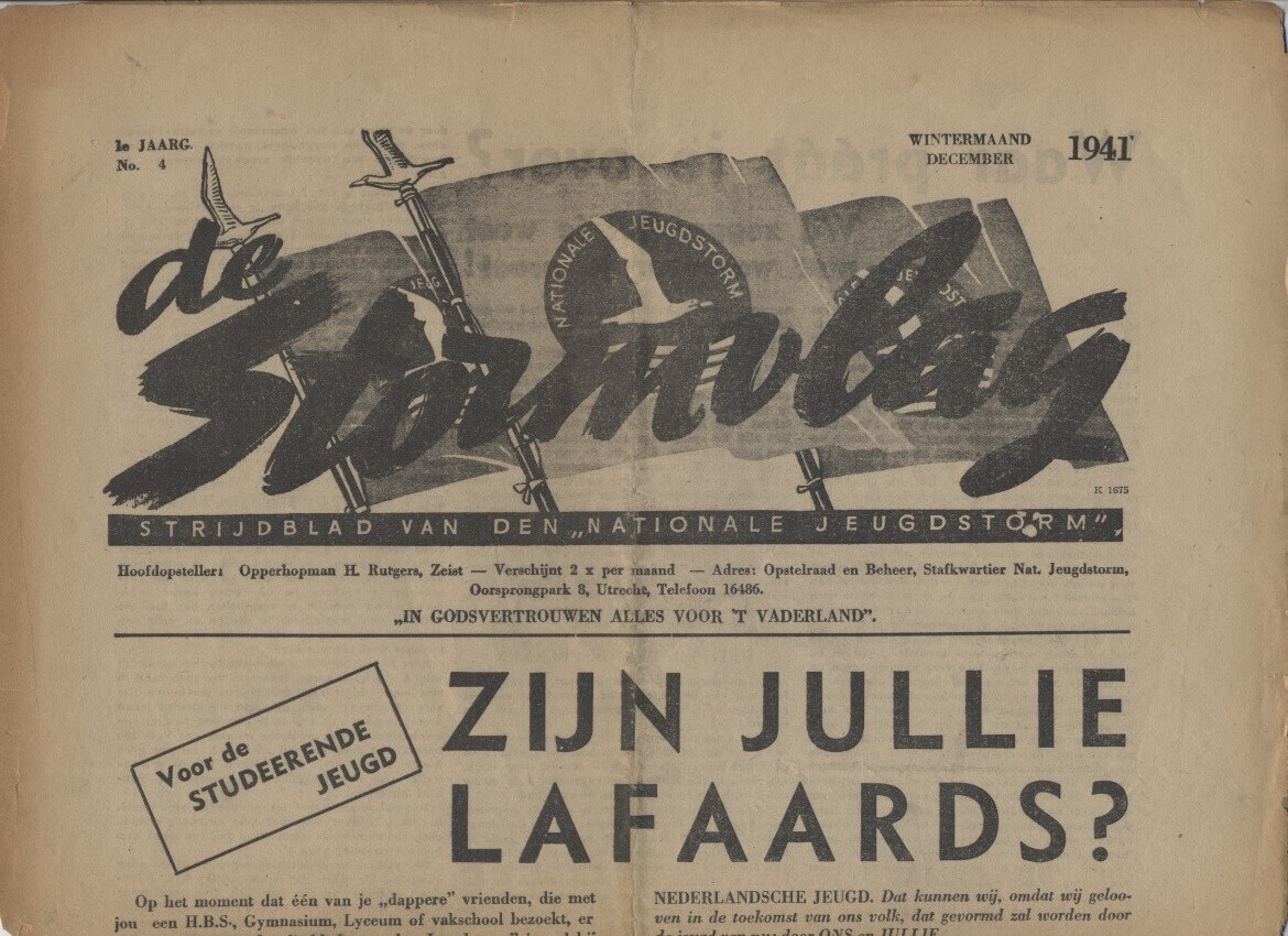Editie van ''De Stormvlag. Sttrijdblad van de Nationale Jeugdstorm". Het betreft nummer 1 van de eerste jaargang Wintermaand-december 1941.