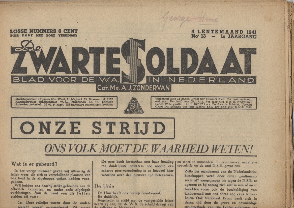Een editie van ''De zwarte soldaat. Blad voor de W.A. in Nederland''.
