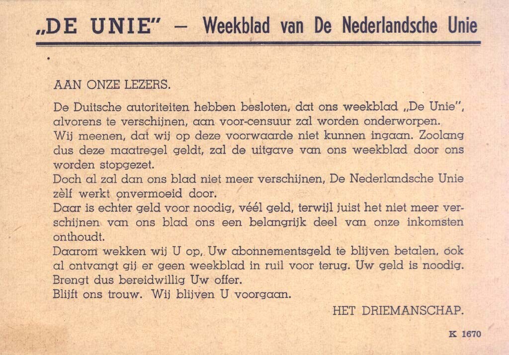 Ongeadresseerde, voorbedrukte briefkaart van de Nederlandsche Unie aan de lezers van "De Unie": met de mededeling dat wegens censuur door de Duitse autoriteiten de uitgave van het weekblad stopgezet.