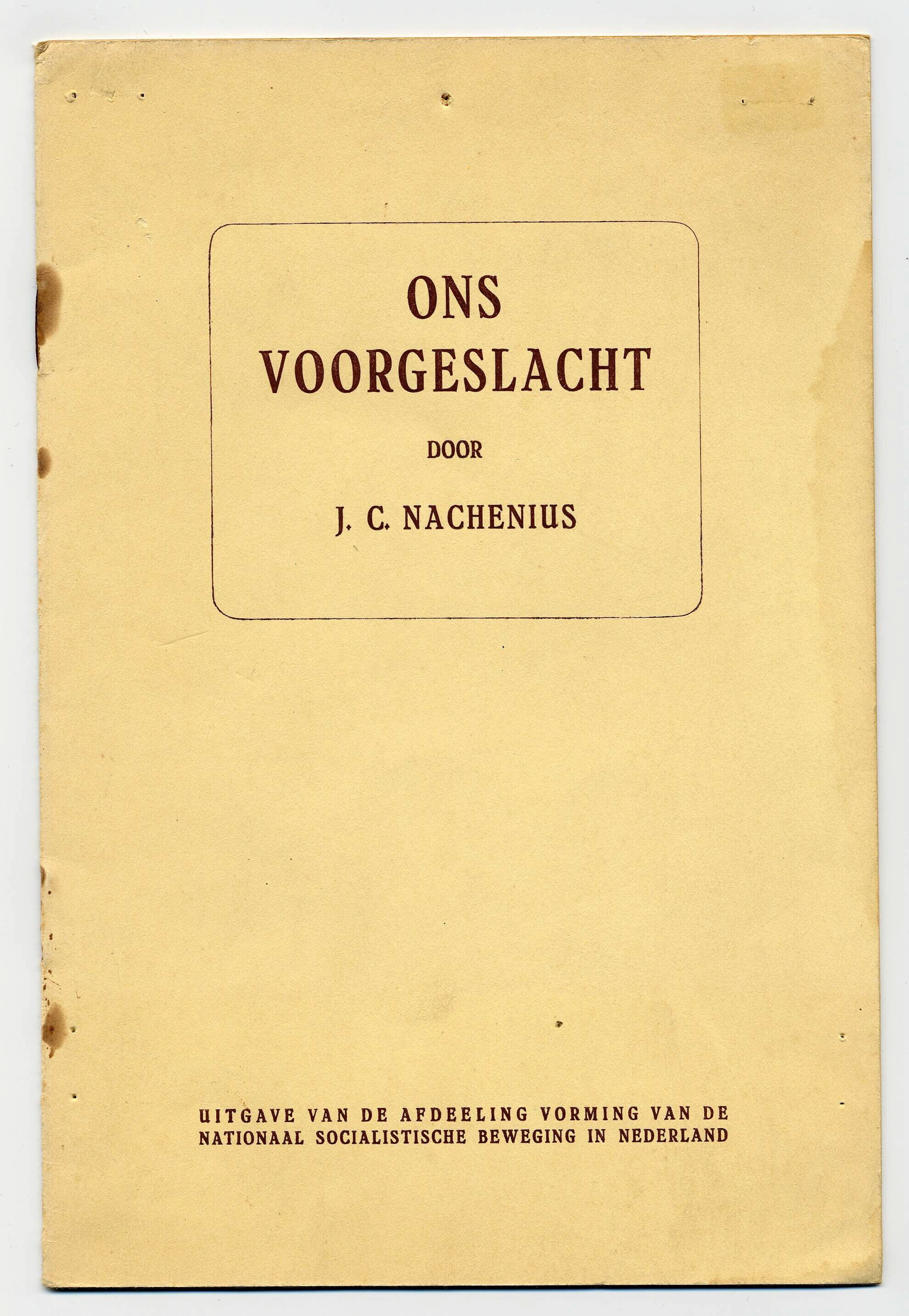 Nationaalsocialistische boekje van de N.S.B. De boek over het ''rassenvraagstuk'' bevat 11 pagina's en is geschreven door J.C. Nachenius, hoofd van de Afdeling Vorming van de Nederlandse S.S.
