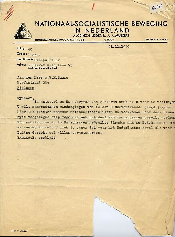 Brief op vel papier met N.S.B.-briefhoofd: "In antwoord op uw schrijven van gisteren dank ik u voor de moeite, die u wilt aanwenden om misdragingen van de aan u toevertrouwde jeugd jegens hier ter plaatse wonende nationaalsocialisten te voorkomen. Door deze uwerzijds toegezegde hulp moge dan ook het doel van mijn schrijven bereikt worden. Ten aanzien van de in uw schrijven gebruikte tirades aan de N.S.B. en de Duitse weermacht zult u zich te zijner tijd voor het Nederlandse zowel als voor het Duitse Gerecht wel willen verantwoorden."